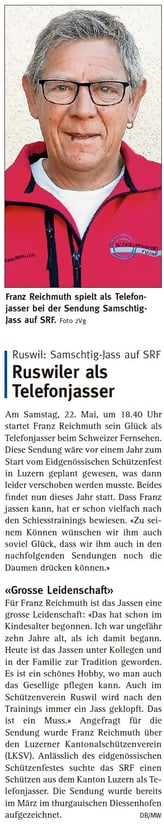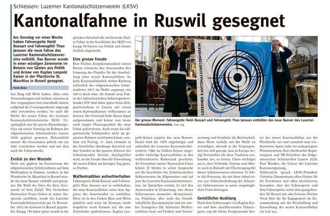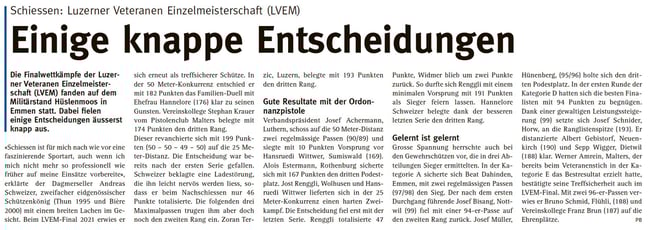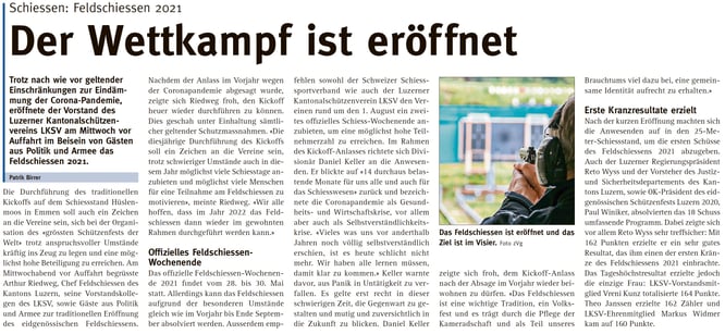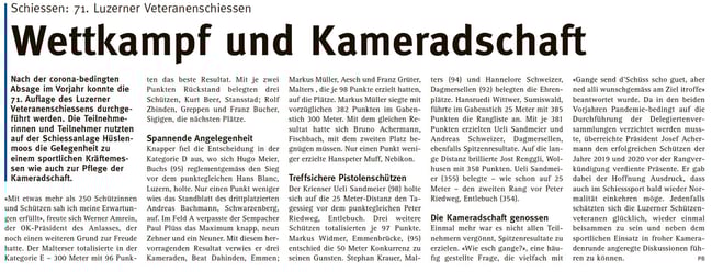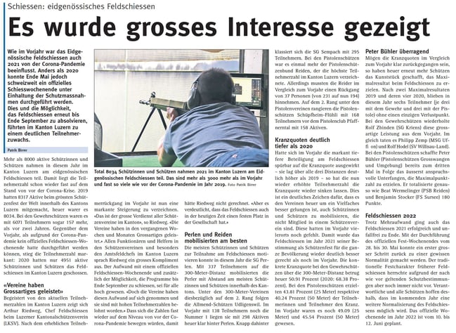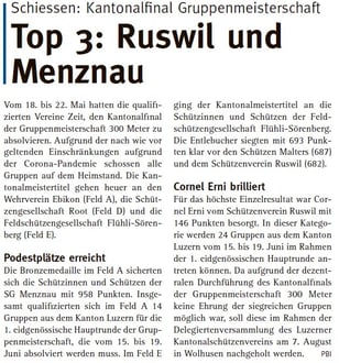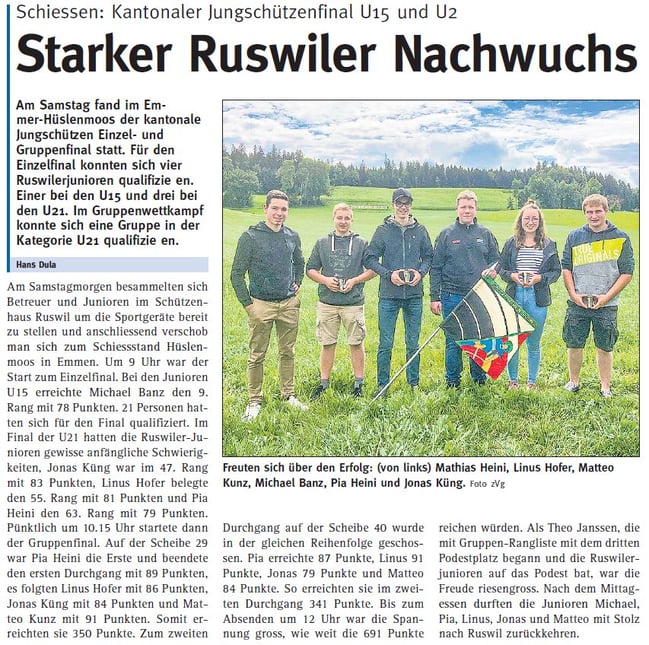 Am letzten Samstag fand im Emmer Hüslenmoos der Schweizer Gruppenmeisterschaftsfinal über 300 Meter statt. Auf Grund der guten Resultate in drei vorherigen Heimrunden konnte sich eine Gruppe des Schützenverein Ruswil bestehend aus fünf Schützen die Finalteilnahme im Feld E sichern. Als eine von total nur 24 qualifizierten Gruppen aus der ganzen Schweiz war das Leistungsniveau vor Ort dementsprechend hoch. Nach der Waffenkontrolle wurde bei sonnigem Wetter und leichtem Wind am Nachmittag geschossen. Die Gruppe aus Ruswil durfte dabei ihr Können auf Scheibe 49 unter Beweis stellen. Da die Schiesszeit begrenzt war, musste der Schützenwechsel aus und in die Schiessposition zügig von statten gehen. Erzielen konnten die Ruswiler 122, 132, 137, 140 und 143 Punkte welches eine Gesamtpunktzahl von 674 Punkte ergab. Mit diesem Resultat klassifizierte sich die Gruppe auf dem 13. Schlussrang. Trotz des Abstandes zum Podest durfte sich die gesamte Gruppe über den Erhalt der begehrten Guppenmeisterschaftskränze freuen. Auszug aus der Rangliste: 1. Niederurnen Stand 1, 696 Punkte 2. Häbernbad FS 1, 694 Punkte 3. Plasselb 1, 682 Punkte